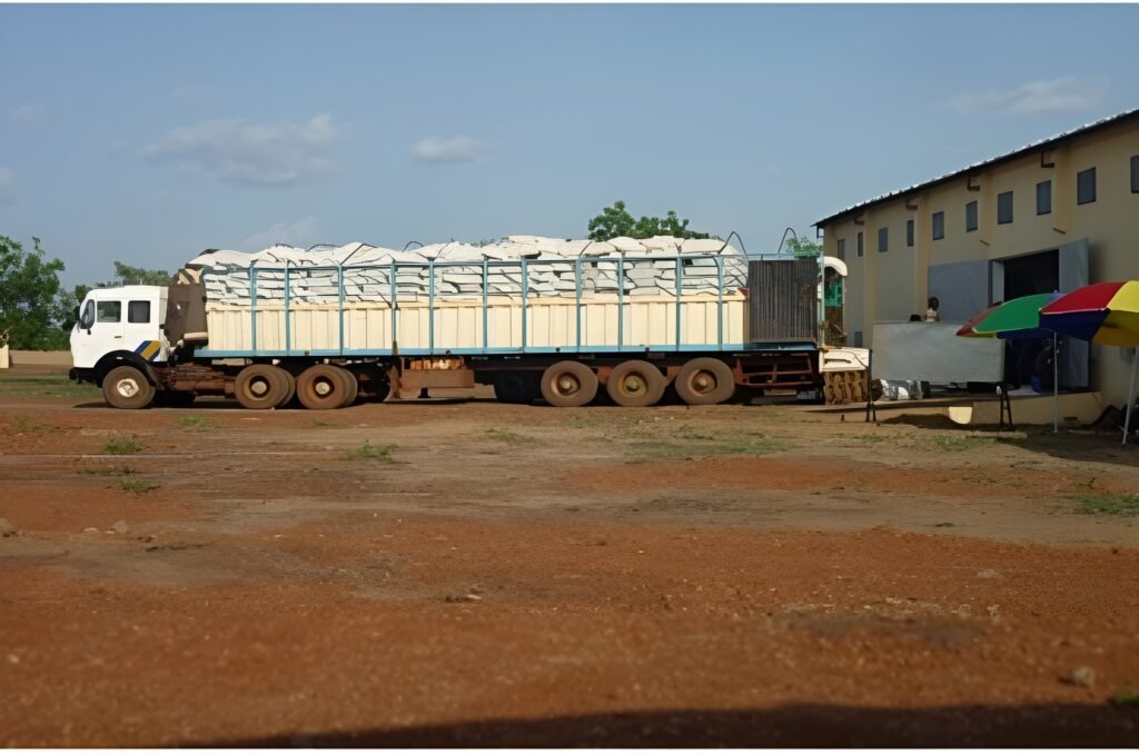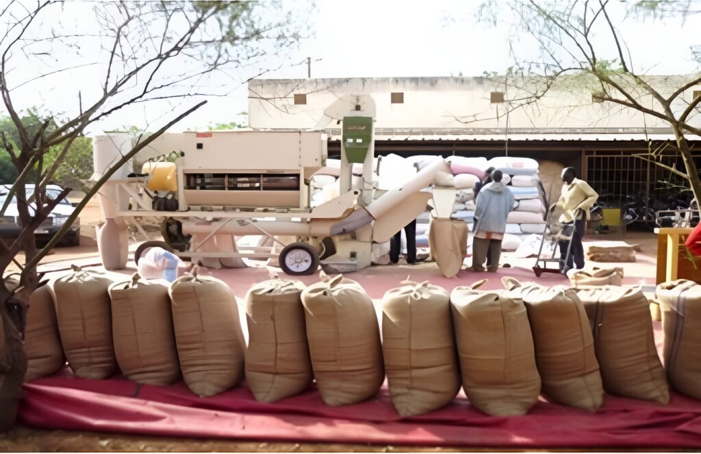 Lignes de nettoyage des céréales, infrastructures de stockage de 11 500 tonnes et camion de 15 tonnes pour la logistique agricole.